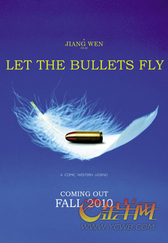 繼《花木蘭》、《狼災(zāi)記》等大片相繼出擊后, 姜文的新片海報也在戛納亮相。這幅畫面簡潔卻極具沖擊力的海報,因為是全英文而一直被中國記者“忽略”,但就吸引了眾多海外片商駐足。海報主色調(diào)為飽滿的藍色,畫面的主體是一顆飛行的子彈和一根飄動的潔白羽毛,子彈下方的三個簡單英文單詞則點出了三大商業(yè)元素:喜劇、西部、傳奇,英文片名為《Let the bullets fly》(直譯:讓子彈飛吧)———這些都透露出該片會是一部與姜文此前作品完全不同的商業(yè)大片。