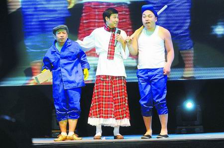 晚9時40分許,全場響起最熱烈的掌聲和叫好聲,“小沈陽!陽仔出來了”的叫喊聲此起彼伏。這次小沈陽雖然還是一身蘇格蘭裝扮,但頭上沒有發(fā)卡,手上的女士花包幾乎沒上過肩,聲音也變得陽剛起來,只在調(diào)節(jié)氣氛時偶爾用一下他擅長的“嚎”音,儼然有轉型的味道。接下來的約40分鐘,不管是中國足球的笑話、還是翻唱《大海》等,場面上熱鬧非常,但關注小沈陽的人會發(fā)現(xiàn),這些東西他已經(jīng)演過很多遍了!