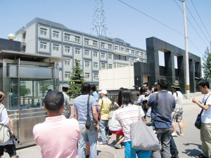 2日晚10時(shí),在朝陽(yáng)北路北京市公安局朝陽(yáng)分局看守所和拘留所的大院門(mén)外的輔路上,已經(jīng)停滿了新聞?dòng)浾叩能囕v,30余名記者手持照相機(jī)或攝像機(jī)已經(jīng)在門(mén)外苦苦等候。昨日早晨7時(shí),陸續(xù)又有數(shù)名記者趕到朝陽(yáng)看守所大門(mén)口參與蹲守。