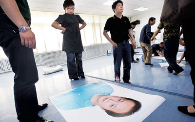 上午10時(shí)許,大廳入口處已經(jīng)擺開(kāi)一排長(zhǎng)桌,工作人員正對(duì)著筆記本挑選羅京的相片,仔細(xì)確認(rèn)相片的尺寸后,交代人員去打印以備布置靈堂之用。