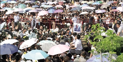 12點(diǎn),羅京夫人劉繼紅淚流滿(mǎn)面、悲痛欲絕,在兒子的攙扶下走出靈堂。康輝、賀紅梅等央視名嘴也不忍與好友永別,掩面哭泣。記者 趙楠楠