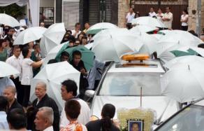報道指出,今日(周六,8月22日)早上約10時15分,朱父正式封棺儀式并準備抬上靈車,從朱宅傳出不少號哭聲。直至11時30分,朱父靈柩在殯儀隊奏樂開路下,從朱家緩緩駛出。走在前頭的是朱家幼女朱麗華的夫婿顏華潤,他在多名親友的雨傘下,企圖以“聲東擊西”的情況引開攝影鏡頭,借此混淆視聽,而大批媒體、攝影記者圍睹上去閃光燈閃不停,使殯儀隊伍行駛緩慢。