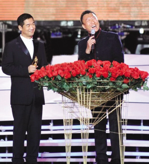 昨晚8時(shí),第27屆中國(guó)電視劇飛天獎(jiǎng)?lì)C獎(jiǎng)典禮在北京“水立方”盛大舉行。本屆“飛天獎(jiǎng)”的明星陣容實(shí)在強(qiáng)大,創(chuàng)下了歷史之最,李幼斌、孫紅雷、張國(guó)立、孫儷、殷桃等眾多電視劇紅人一一登場(chǎng);《闖關(guān)東》、《潛伏》、《金婚》、《士兵突擊》等20多個(gè)劇組分別亮相,十分熱鬧。最受關(guān)注的優(yōu)秀男女演員獎(jiǎng)昨晚現(xiàn)場(chǎng)揭曉,“佟掌柜”閆妮和薩日娜同獲“飛天”優(yōu)秀女演員獎(jiǎng)。優(yōu)秀男演員獎(jiǎng)杯則被張國(guó)立和孫紅雷抱了個(gè)滿懷。昨晚最高興的非孫紅雷莫屬,握著獎(jiǎng)杯的他快把嘴笑歪了。