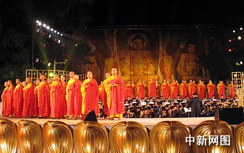 中新社韶關(guān)九月二十一日電(馮昶 李凌)九月二十日晚,素有禪宗祖庭之譽的廣東韶關(guān)南華禪寺廣場禪音繚繞。二00九禪宗六祖文化節(jié)在“壇經(jīng)梵音”音樂晚會的禪樂聲中開幕。來自中國內(nèi)地及港澳臺地區(qū)的諸山長老及善眾四千多人參加了這次大型禪音樂會。