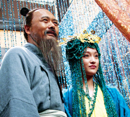宮殿內(nèi),周潤(rùn)發(fā)扮演的長(zhǎng)須孔子跪在殿中,身著藍(lán)色華服、頭頂金色鳳冠、腳踏超高木屐、手執(zhí)羽毛蒲扇的“南子”周迅滿臉含笑,繞場(chǎng)一周端詳孔子,然后一膝跪下,口中念念有詞:“聽(tīng)說(shuō)夫子在魯國(guó)教書,有句‘窈窕淑女、君子好逑’,夫子可知否?”在得到肯定回答后,南子湊到孔子跟前,繼續(xù)“眉目傳情”:“不知詩(shī)三百里有多少男女之事?”“孔子”答曰:“詩(shī)三百,一言以蔽之,思無(wú)邪!