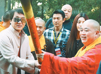 中新網(wǎng)10月23日電 劉德華將在新片《新少林寺》中拜成龍為師學(xué)功夫!昨天河南少林寺的寧靜被打破,宣揚(yáng)武術(shù)精神的《新少林寺》開鏡,成龍、劉德華、謝霆鋒、范冰冰、吳京齊聚少林寺,現(xiàn)場(chǎng)貴賓、武校學(xué)生見到巨星全變粉絲,拚命圍上前來,場(chǎng)面一度失控,成龍則發(fā)揮大哥本色指揮現(xiàn)場(chǎng),呼吁大家維持秩序。
