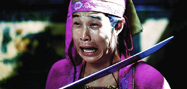 在影片中小沈陽出演的是一面館小伙計,雖然身量“弱不禁風”,但卻對武功特別癡迷,小沈陽說:“這是一挺陽光的小伙,平時好說好鬧,他爸爸是個殺豬的,挺有錢,他一門心思地練武功,自詡為‘武林中人’。”有趣的是小沈陽的造型,絕對稱得上是“嬌艷”,不是小紅襖里配個紅布兜,就是翠生生的綠長袍,再配上他那幾下花拳繡腿,不等說臺詞就能讓人樂噴了。看來張藝謀也充分發(fā)掘了小沈陽“男扮女裝”的表演特色,他在評點這個人物時自己更笑不攏嘴,“他造型簡直像新版‘西門慶’,服裝的效果讓他很‘水靈’,而他的表演最有特點的就是眼睛。”小沈陽自稱塑造了有史以來最經(jīng)典的“俠客”形象,他在片場常念叨的搞笑臺詞是:“我是令狐沖的弟弟——大蔥!