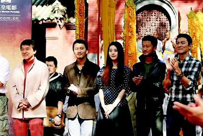 昨日現(xiàn)場(chǎng),在成龍、劉德華、謝霆鋒、范冰冰等明星悉數(shù)亮相后,現(xiàn)場(chǎng)的嘉賓和武校的學(xué)生們都紛紛圍上去想和偶像近距離接觸,場(chǎng)面一度失控。成龍一出場(chǎng)就發(fā)揮他的“大哥”本色,呼吁現(xiàn)場(chǎng)人士維持秩序,而劉德華也呼吁大家小心安全!缎律倭炙隆吩诮衲瓿蹙鸵呀(jīng)開始籌備,在確定了成龍、劉德華二位影壇巨星加盟之后,女主角卻遲遲定不下來。曾經(jīng)一度傳出張柏芝、周迅等多位一線女星爭(zhēng)相加盟,競(jìng)爭(zhēng)異常激烈。昨日范冰冰的出現(xiàn),結(jié)束了女主角的懸念。