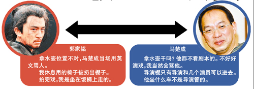 馬楚成感嘆說:“我入行多年,合作過那么多的演員,從來沒有投訴過我。我為什么說他,他是我遇到過的最差的演員。說他坐送飯的車離開片場,你覺得導演可以管得到一個演員坐什么車嗎?這不是導演管的事情。至于郭家銘投訴自己的椅子被扔的事,馬楚成笑道:“在片場為了保證拍片的秩序,導演棚只有導演、副導演和幾個演員,比如趙薇和陳坤可以進去看,但他非要沖進來,還跟工作人員吵架。算了,你就直接說我不作回應好了,我作了回應回頭還要說我?guī)退醋髂。”記者周?