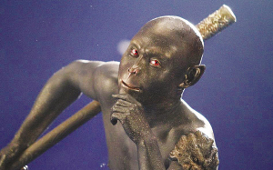 已經(jīng)進(jìn)入最后拍攝階段的張紀(jì)中版新《西游記》日前又曝光一組孫悟空的全新造型。此次曝光的劇照,專為孫悟空被太上老君煉丹爐煉燒的戲份設(shè)計(jì)(上圖)。從劇照中看,由于猴毛在煉丹爐里完全被燒光,這個(gè)造型中,吳樾脫掉“猴毛衣”,每一寸皮膚都涂滿烏金色,整個(gè)人都如少林寺18銅人一般。另外值得一提的是,因?yàn)橥嗜チ恕昂锩隆,原原本本露出了“猴耳朵”,使得這對(duì)備受爭(zhēng)議的尖耳朵更加凸顯,再加上經(jīng)過處理的紅色眼球,以及長(zhǎng)長(zhǎng)的尾巴,整體看起來(lái)就是一個(gè)具有中國(guó)特色的“阿凡達(dá)”。(張漪)