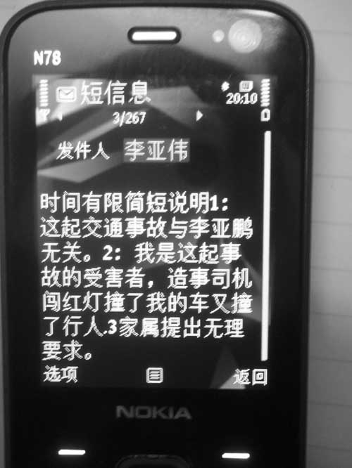 昨天,李亞偉接受了本報記者的采訪,針對“車禍門”事件,他給記者發(fā)來短信表明態(tài)度——1:這起交通事故與李亞鵬無關。2:我是這起事故的受害者,造事(應為肇事)司機闖紅燈撞了我的車又撞了行人。3:家屬提出無理要求。