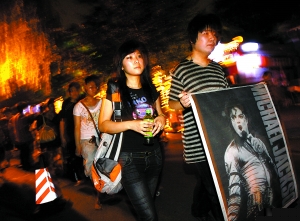 昨晚,歌迷手持邁克爾·杰克遜的照片繞后海行走,悼念這位樂壇巨星。美國(guó)流行樂壇巨星邁克爾·杰克遜25日因心臟病發(fā)作在洛杉磯一家醫(yī)院不治身亡,終年50歲。為確認(rèn)杰克遜的死因,洛杉磯驗(yàn)尸官今日將進(jìn)行尸檢。