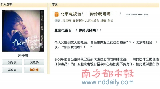 由于滿文軍吸毒案引起轟動(dòng)的緣故,北京電視臺(tái)近日再次報(bào)道明星吸毒事件,將沙寶亮04年卷入青島夜總會(huì)吸毒一事再度重提,并以主觀口吻稱“沙寶亮涉嫌沾染毒品”、“沙寶亮至今仍不承認(rèn)吸毒”。前日,沙寶亮本人在個(gè)人博客上嚴(yán)正聲明:我從未沾染過(guò)任何毒品!并直接針對(duì)北京電視臺(tái)表示:“今天我最后一次很嚴(yán)肅也很客氣地跟你說(shuō):你給我閉嘴!”