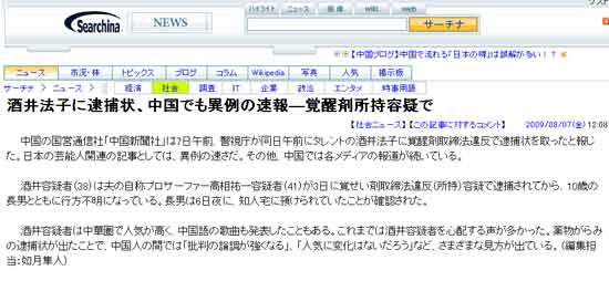 中新網8月7日電 日本外務省“中國情報局”(searchina)網站今天刊登消息,對中新網快速報道“酒井法子涉嫌違反《興奮劑取締法》,警方向檢方申請逮捕狀”,評價是“罕見的迅速”。