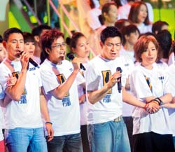 昨晚會(huì),劉德華從頭到晚穿梭在舞臺(tái)上,先與鄭秀文合唱〈喝采〉,再與任賢齊演唱臺(tái)語歌〈天下第一等〉鼓勵(lì)臺(tái)灣,稍晚也與譚詠麟、陳百祥、溫拿五虎演唱〈朋友〉,日前他自費(fèi)來臺(tái)賑災(zāi),連趕兩臺(tái),回港后又與曾志偉合辦“88水災(zāi)關(guān)愛行動(dòng)”,為臺(tái)灣出錢出力。