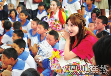 昨日上午,林志玲領(lǐng)銜,曾寶儀、光良、江美琪、許慧欣、謝娜、譚維維、胡彥斌、弦子、楊紫等走進了嶄新的“安康家園”棠湖小學,這里生活著幾百名因地震受創(chuàng)的孩子。而在校區(qū)食堂,一個簡單隆重的“愛在傳遞”安康家園兒童心系臺灣小朋友活動正在舉行,60余位小朋友看著電視上的大明星來到了他們身邊,都非常興奮,還獻上了潔白的哈達。