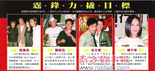 謝霆鋒自組公司的傳聞不是一天兩天的事兒了,昨天新鮮出爐的香港某周刊又重提“舊事”,稱盡管英皇開出不少優(yōu)越條件留人,但謝霆鋒“去意已決”,而老婆張柏芝亦是“無限量支持”,當(dāng)做新公司第一簽約藝人。據(jù)稱謝霆鋒心中已有不少“挖墻腳”的人選,目標(biāo)包括陳奕迅、楊千女華、余文樂等一幫友人,楊千女華對此以“還沒正式談,我自己都還不知道,告訴你什么呢?”作回應(yīng)。———謝霆鋒與英皇的合約尚未到期,為何老刮“跳槽”這陣風(fēng)?恐怕是:管它真亦假,先炒再說!