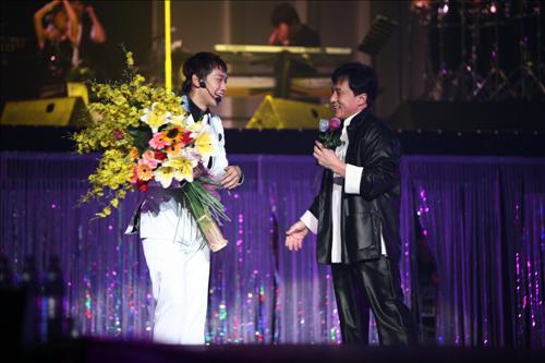 當天,Rain在演唱《Ranism》,現(xiàn)場氣氛達到高潮時,成龍手拿花束登上舞臺,向粉絲傳達問候后說:“因為趕飛機,我馬上要回去,但是我想跟Rain緊緊擁抱、親個吻!