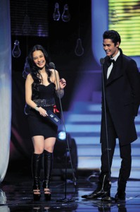 2009MTV超級(jí)盛典昨天在大劇院舉行。成龍、莫文蔚、WonderGirls、飛輪海齊齊成為座上賓,可誰(shuí)都沒(méi)有阿嬌遭遇如此大的尷尬與障礙。先是因?yàn)橘澲膛c自己代言的品牌沖突,導(dǎo)致電視臺(tái)拍攝的畫(huà)面無(wú)法播出,后是在臺(tái)上與混血模特?zé)o法用英文順暢交流,令她在臺(tái)上連喊“尷尬”。