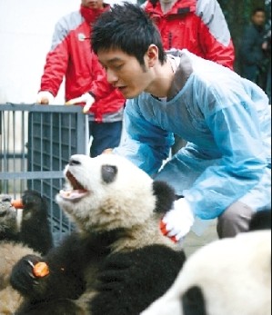 昨日,由臥龍中國保護大熊貓研究中心精心遴選的10只大熊貓,從該中心雅安碧峰峽基地啟程前往助陣上海世博。作為“中國保護大熊貓研究中心熊貓愛心大使”的黃曉明,同時又是成都和雅安的熊貓愛心大使,以及上海世博會志愿者宣傳大使,特意向劇組告假趕到雅安現(xiàn)場。此行他不僅是為了宣傳保護大熊貓和世博,最重要的是為了來替自己的一雙“兒女”送行。原來由他出資百萬元認養(yǎng)的地震后出生的全球首對雙胞胎大熊貓“平平”、“安安”這次就將以“哥哥”、“姐姐”的身份帶領(lǐng)另外8只熊貓遠赴上海世博。(春城晚報)