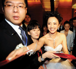 天后王菲的駕到,使得這場(chǎng)婚禮頗具轟動(dòng)效應(yīng),也許是王菲的星光太過耀眼,以至于隨后新郎和新娘、伴郎張楊、伴娘薛佳凝的露面都有些暗淡。
