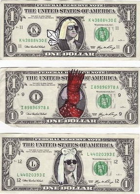 據(jù)外國(guó)媒體報(bào)道,美國(guó)流行音樂(lè)歌手、個(gè)性“舞后”lady gaga,如今可謂是紅得發(fā)紫,而她的影響力有多大?日前,美國(guó)一畫(huà)家,就將印有美國(guó)第1任總統(tǒng)喬治·華盛頓頭像的1美元鈔票,篡改成lady gaga的經(jīng)典造型。lady gaga享受到了一回和美國(guó)總統(tǒng)平起平坐的待遇。