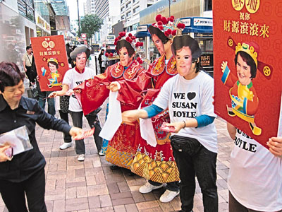 至于香港的蘇珊大媽粉絲也不甘示弱,近日戴起面具兼穿上“愛珊Tee”向途人大派“蘇珊財神”,代偶像祝港人今年財源滾滾。有關方面也推出了賀年新春限量版CD應節(jié),附送蘇珊“心想事成”紅包10個,以配合唱片主題“我有個夢想”。