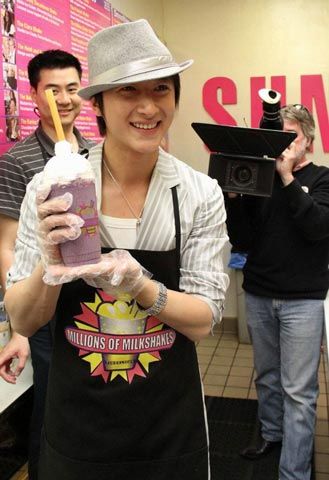 中新網(wǎng)3月25日電 因解約事件而有一段時(shí)間沒(méi)有公開(kāi)露面的Super Junior中國(guó)籍成員韓庚,近日現(xiàn)身美國(guó)洛杉磯某知名奶昔店,制作以自己名字命名的奶昔產(chǎn)品“韓庚舞動(dòng)奶昔”。