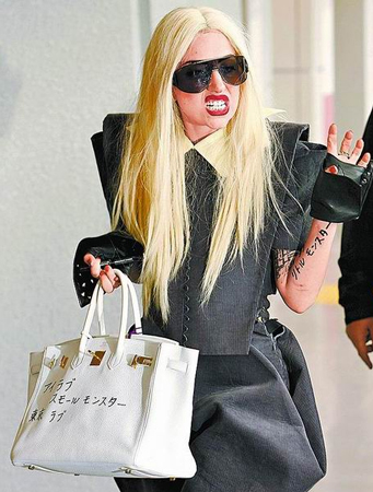 報道描述,Lady Gaga手跨柏金包,用日語寫著“我愛小怪物,我愛東京”,不知是不是要討好日本歌迷。