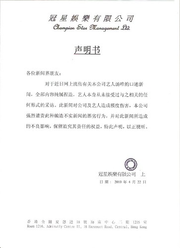 對于近日網上流傳有關本公司藝人湯唯的口述新聞,全部內容純屬捏造,藝人本身從未接受過與之相關的任何形式的采訪。此新聞對公司及藝人造成極度傷害,本公司強烈譴責此種編造不實新聞的惡劣行為,并對此新聞造成的不良影響,保留追究其責任的權益,特此聲明,以正視聽。