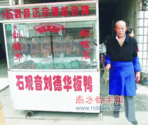 據(jù)悉,觀勝鎮(zhèn)賣板鴨的有幾十家,每一家多用店主名字注冊作為招牌。而劉老伯在1980年已創(chuàng)立以自己姓名命名的板鴨店,2004年申請“劉德華牌板鴨”注冊成商標(biāo),2007年申請成功。