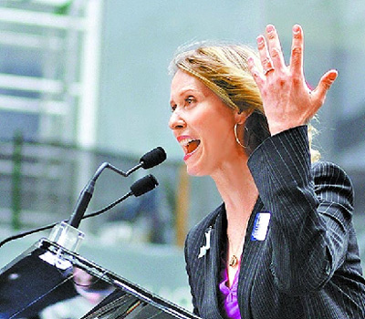 辛西亞3年前罹患乳癌,女友不離不棄陪她對(duì)抗病魔。她前天在記者會(huì)上公布訂婚喜訊,她說(shuō):“如果同志婚姻在紐約合法,我們一定會(huì)結(jié)婚。我不想假裝結(jié)婚,我們要真正的、合法的,能夠得到州政府認(rèn)可的婚姻!毙廖鱽喌暮糜选队鞘小分械摹跋木G蒂”克里斯廷·戴維斯,前天現(xiàn)身力挺她。