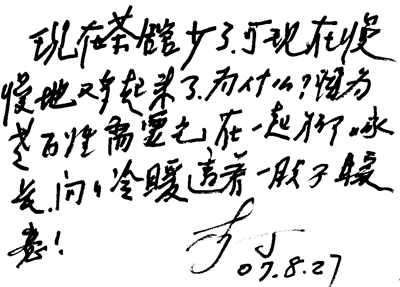 2007年,李丁做客《京華茶館》時(shí)的留言。