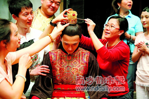 李少紅執(zhí)導的新版《紅樓夢》歷經(jīng)一年三個半月的緊張拍攝,終于在昨日殺青。“寶玉”楊洋也在這一天迎來了自己的18歲成年生日。昨日,劇組殺青之日,導演李少紅與近百名演職人員一起,為“成年寶玉”楊洋舉行了熱鬧的成人禮。李少紅親手為楊洋摘下通靈寶玉,象征劇組正式殺青;隨后,李少紅又為楊洋戴上金冠,取意“加冠成人”(左圖)。楊洋感動得語帶哽咽:“18歲生日在劇組度過,我覺得很有意義。它對劇組的拍攝工作是一個圓滿的終點,但對于我個人來說,卻是人生新的起點!