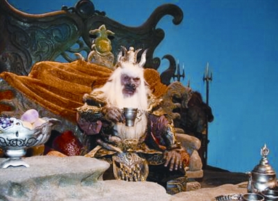 當(dāng)記者來到攝影棚時,正在拍攝的場景是牛魔王殿前獨酌的一場戲,身為主角的唐僧師徒四人則不見蹤影,只見魁梧威嚴(yán)、黑臉白須的“牛魔王”端坐在寶座上,數(shù)十名青面獠牙的“小妖”分列兩旁。(周文韜)
