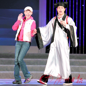最讓人期待的小沈陽(yáng),雖然這次“爺們”了不少,沒(méi)再穿蘇格蘭格子裙,著一套黑色西服出場(chǎng),但讓人驚喜的段子也就只有以水果比喻女人以及唱著粵語(yǔ)歌、背著喜羊羊書包扮寧采臣出場(chǎng)演《倩女幽魂》那一段,他和老婆沈春陽(yáng)的調(diào)侃以及《大話西游》的小品依然是炒冷飯。不過(guò),小沈陽(yáng)一出場(chǎng),觀眾的情緒就明顯高漲,還先后有兩位大膽女粉絲上臺(tái)送花獻(xiàn)吻,完全當(dāng)同臺(tái)的沈春陽(yáng)“透明”。
