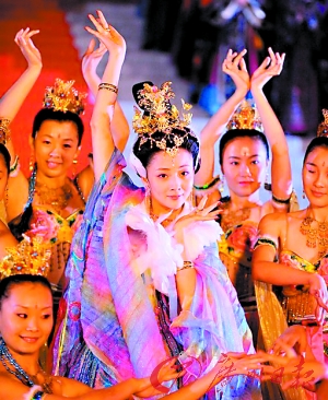 在《楊貴妃秘史》的拍攝基地,記者們首次看到了該劇剛剛制作完成的40分鐘片段。在片花中,演員們?nèi)A麗的服飾十分搶眼,“霓裳羽衣舞”也得到了完整展示,尤小剛表示,片中的舞蹈段落非常多,全劇拍攝的4個(gè)月中,舞蹈團(tuán)隊(duì)就跟了三個(gè)半月,“大家都以為拍古裝戲,打仗的場(chǎng)面最難拍,其實(shí)不然。拍攝這部劇最難的是在復(fù)原很多鮮為人知的唐朝文化細(xì)節(jié)。觀眾在這部劇中可以看到數(shù)百人組成的唐代宮廷樂隊(duì),黃秋生扮演的李隆基也表演了好幾段舞蹈!