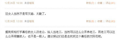 上周章子怡海報被潑墨,有媒體報道稱幕后策劃是和章子怡合作過的某女子,有網(wǎng)友猜測是傳媒大亨默多克妻子鄧文迪,一時間傳得沸沸揚揚。而洪晃則在微博爆料稱“這女人當(dāng)然不是鄧文迪。據(jù)我所知打手幕后的女人沒老公,給人當(dāng)老三……”