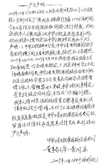 4,對于有關(guān)媒體沒有經(jīng)過核實(shí)發(fā)表“虛假報(bào)道”,中華衛(wèi)星電視集團(tuán)有限公司保留通過法律程序追究其法律責(zé)任的權(quán)利。