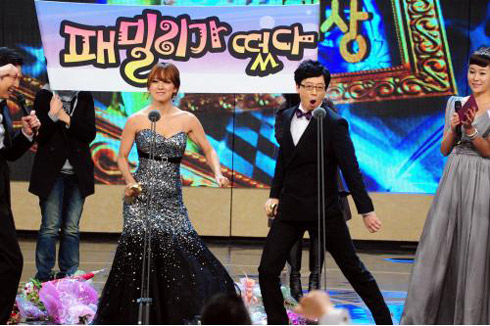 李孝利和劉在錫曾在去年的SBS演藝大獎(jiǎng)?lì)C獎(jiǎng)禮中憑借《家族誕生》雙雙獲得大獎(jiǎng)。