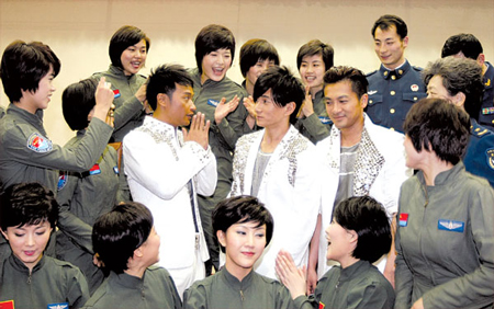 16位曾翱翔的藍(lán)天上的女飛行員們,一股腦兒地?cái)D上前去與偶像合影,當(dāng)紅女星閆妮則一掃平日里的害羞個(gè)性,看到小虎隊(duì)三人時(shí)像個(gè)小粉絲一樣跳起來(lái)表達(dá)著自己的興奮之情。一片混亂中,有位央視的記者一不留神被擠掉入彩排大廳一號(hào)入口處的水池里。某家網(wǎng)站的攝像記者在跟隨著小虎隊(duì)的步伐倒退著拍照時(shí),突然流下眼淚,之后他對(duì)同行說(shuō):“鏡頭一推上去,實(shí)在是觸景生情,可能是太久沒(méi)有看到他們?nèi)齻(gè)人一起出現(xiàn)了!