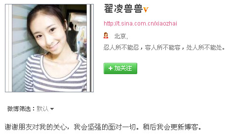 翟凌在微博中寫道:“謝謝朋友對我的關(guān)心,我會堅(jiān)強(qiáng)的面對一切。稍后我會更新博客!