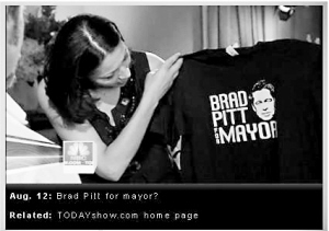 現(xiàn)在,市長競選的宣傳工作已經(jīng)啟動,除了競選徽章出爐,還有許多市民從7月份開始身穿印有“Brad Pitt for Mayor(選布拉德·皮特當(dāng)市長)”字樣的T恤。該T恤在當(dāng)?shù)刭u到20美元一件。