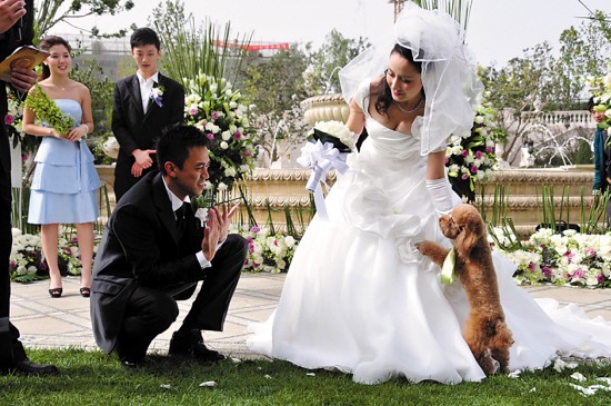 王學(xué)兵和孫寧別有新意地用他們的愛犬充當(dāng)傳遞愛的使者,由愛犬將結(jié)婚戒指帶到現(xiàn)場(chǎng)。交換結(jié)婚戒指后,王學(xué)兵與孫寧舉起香檳向親友祝酒。