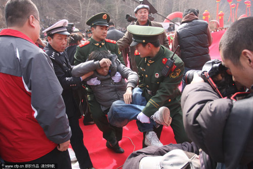 下午1時50分左右儀式開始,陳凱歌上臺發(fā)言后,在場圍觀民眾為爭看明星開始出現(xiàn)擁擠,約300民眾涌上一個高約一米、專為記者拍攝而設(shè)的木制看臺。大約三分鐘后,看臺疑不堪負重,突然倒塌。在前排拍攝的記者如滾地葫蘆般墜地,三角架、攝影機倒地損毀。在場的公安、武警將受傷的10名記者抬離現(xiàn)場,送院救治。
