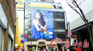 章子怡為著名手表廠商歐米茄做代言的大幅廣告海報(bào)當(dāng)?shù)貢r(shí)間4月3日出現(xiàn)在日本東京最繁華的市中心新宿街頭。(余樂(lè))