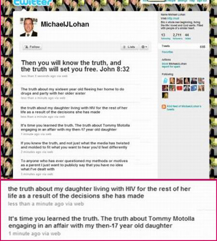 臺(tái)灣“今日新聞”報(bào)道稱,邁克爾在其微博上說(shuō),林賽現(xiàn)在的行徑會(huì)如此荒唐,完全是因?yàn)榈昧税滩。虼怂龥Q定就這樣渾渾噩噩過(guò)一生!但很快邁克爾卻突然將消息撤下,聲稱自己的微博網(wǎng)頁(yè)被黑客入侵,網(wǎng)頁(yè)上所言都不是事實(shí)。