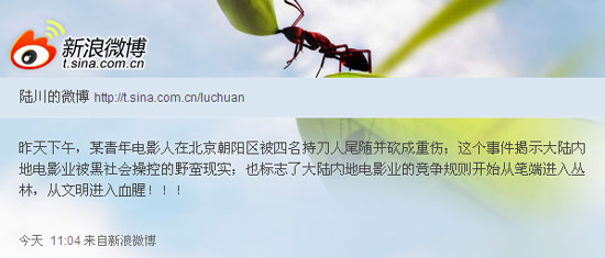 9日上午11時04分,導(dǎo)演陸川在微博稱:“昨天下午,某青年電影人在北京朝陽區(qū)被四名持刀人尾隨并砍成重傷。”陸川還在微博中分析,懷疑此事和某些黑勢力有關(guān)。他還表示:“這個事件標(biāo)志了大陸內(nèi)地電影業(yè)的競爭規(guī)則開始從筆端進入?yún)擦,從文明進入血腥。。