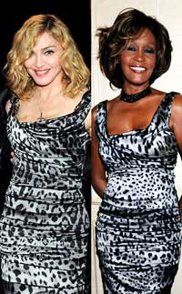 目前正在全球展開(kāi)巡回演唱會(huì)的麥當(dāng)娜,日前穿上一襲Dolce & Gabbana灰色豹紋小洋裝赴宴慶功,竟與惠特妮休斯頓在新專輯發(fā)表會(huì)上穿的洋裝是同一款式,兩大老牌歌后選在同日撞衫,相互較勁的意味濃厚。
