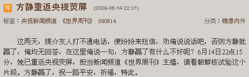這兩天,媒介友人打不通電話,便紛紛來短信,勸俺說說話吧,否則方靜就贏了,俺均無回答,在這里俺說一句,方靜贏了有什么不好呢?6月14日22點(diǎn)15分,她已重返央視熒屏,擔(dān)當(dāng)新聞?lì)l道《世界周刊》主播,請(qǐng)看朝鮮核試驗(yàn)這個(gè)片段。方靜贏了,祝一路平安,祈福,特此。
